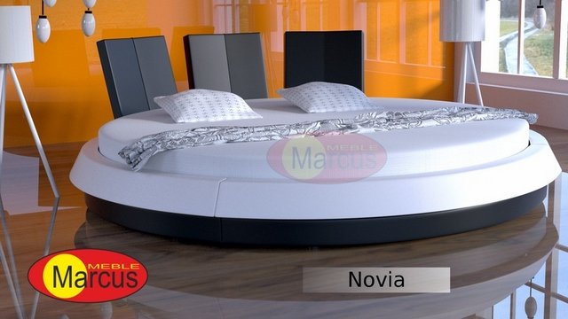 Ekskluzywne łóżko okrągłe Novia. Łóżko tapicerowane w całości (100%) miękką skórą ekologiczną. Łóżko w komplecie z materacem piankowym średniotwardym. Zastosowano w materacu wysokiej klasy piankę wysokoelastyczną Boki łóżka wykonane z drewna, płyty meblowej oraz pokryte warstwą miękkiej pianki tapicerskiej. Oparcie wykonane z miękkiej pianki tapicerskiej. Łóżko posiada solidne nogi.